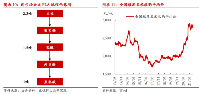 据公开资料显示,生产1吨的聚乳酸需要2.5吨的玉米。基于环评报告我们可以计算出,加上人工、固定资产折旧和三费,聚乳酸的加工成本约为13,066元/吨。目前PLA在建和拟建产能约为199万吨,即便全部投产,对玉米的消耗量仅增加498万吨,而2020年我国玉米产量为2.61亿吨,PLA的原料占比不到2%,所以PLA的投产基本上不受原料供应的限制。2013至2021年,我国玉米价格波动在1,700-2,900之间,若以此价格区间计算,PLA的成本较为稳定,在10,300~13,300元/吨之间波动。