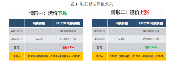 模拟案例1:当前集装箱运价连续上涨,EU2203(上海→欧基2022年3月合约)盘面价格达到$8000/TEU。班轮公司A分析认为明年年初疫情将得到控制,港口拥堵情况将大为缓解,运价有下跌可能,希望提前锁定运价,便在此价位下空单。无论明年3月上海-欧基航线运价上涨还是下跌(如下跌至$7500/TEU或上涨至$9000/TEU),不考虑基差情况,班轮公司A都将获得$8000/TEU的总收入。