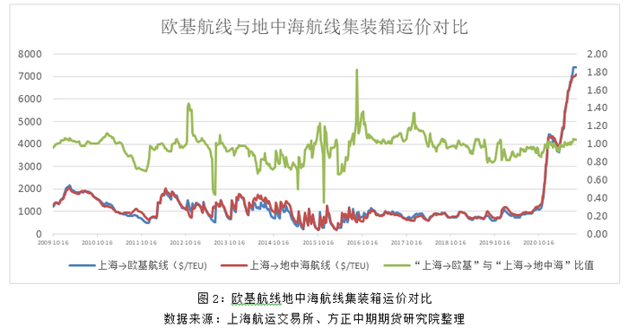 第三,“中国至北欧”与“中国至地中海”的运价也有极高相似度和趋同性。对比上海航运交易所的SCFI上海→欧基和上海→地中海两条航线的最近12年数据可以看出,两条航线的相关系数达到99.2%,上海→欧基/上海→地中海运价的平均比值为0.97。因此,“中国→欧洲五大基本港”可以进一步延伸至“中国→北欧/地中海”。