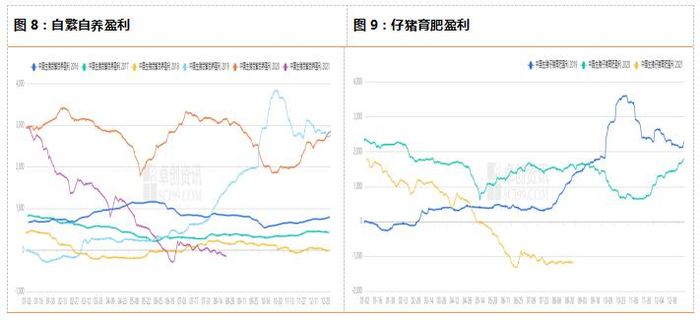 从上图可以看出,养殖企业多数处于亏损状态,截至8月24日,仔猪育肥盈利为-1182.24元/头,自繁自养为-153.61元/头。随着猪价的走低,自繁自养模式相比外购仔猪方式的优势正逐步消失。在多数养殖企业亏损状态下,警惕扎推出栏带来的短期较大的负面影响。