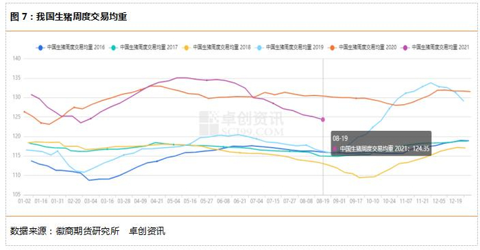 作为从业者情绪的“晴雨表”的生猪交易均重,自5月初开始一路下滑,截至8月19日,全国生猪平均交易体重124.35公斤,环比跌0.61%,同比跌4.44%,体重带来的供给压力有所减轻,但相比2019、2018、2017、2016年,依然处于高位。