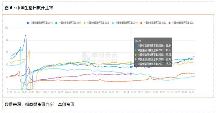 截至8月23日,全国重点屠宰企业平均开工率为25.24%。因新冠疫情影响力度减弱,河南、苏皖、江西、湖北、湖南生猪及猪肉调运恢复,养殖场出栏积极性高,屠宰厂收购顺畅,开工率顺势增加。但其余地区因消费不振,开工率小幅走低。综合来看,受部分地区拉涨,开工率整体小涨。