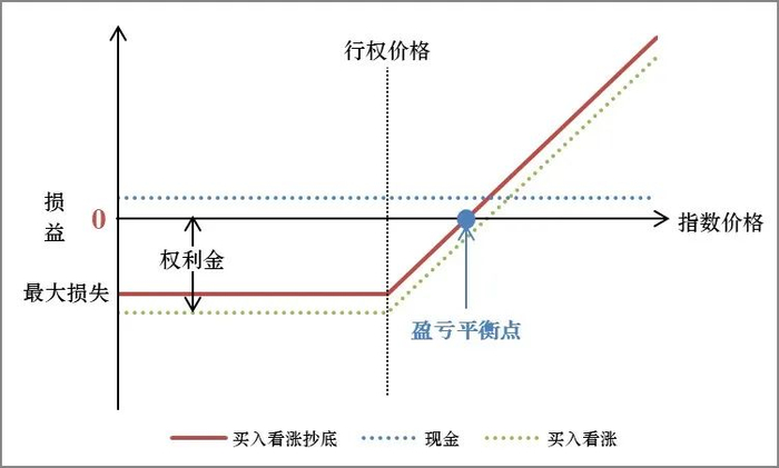 利用看涨期权抄底,其原理为购买股市的“踏空保险”,在股市上涨的时候获得收益,在股市下跌的时候仅损失权利金。最常用的策略是将少部分资金用于购买股指看涨期权,将剩余资金以现金或固定收益产品的形式持有。