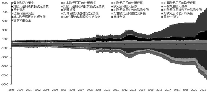 图为欧洲央行资产负债表资产端与负债端结构及变化趋势(单位:10亿欧元)