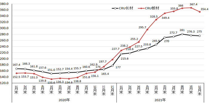 10月份,CRU长材指数为275.0点,环比下降1.3点,降幅为0.5%,连续两个月下降;CRU板材指数为354.4点,环比下降13.0点,降幅为3.5%,环比由升转降;与去年同期相比,CRU长材指数同比上升112.1点,升幅为68.8%;CRU板材指数同比上升198.3点,升幅为127.0%。(见下图)