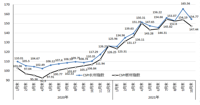 10月末,CSPI长材指数为154.77点,环比下降10.79点,降幅为6.52%;CSPI板材指数为147.44点,环比下降6.75点,降幅为4.38%;长材价格降幅比板材高2.14个百分点。与上年同期相比,长材、板材指数分别上升44.42点和40.60点,升幅分别为40.25%和38.00%。(见下图、表)
