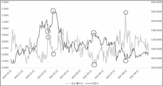 我们选取了2020年10月21日至2021年10月21日共244个交易日的沪深300指数与沪深300指数期权成交量PCR的数据,经计算得出两者相关系数为-0.436,有一定的负相关关系,取不同滞后阶数未见相关性明显提高。绘制如图1所示趋势关系图,可以看出两者在趋势上尤其是拐点有较为明显的负相关关系:比如2021年1月29日和8月20日成交量PCR的高点对应了股指的低点,2021年2月10日和5月28日成交量PCR的低点对应了股指的高点。