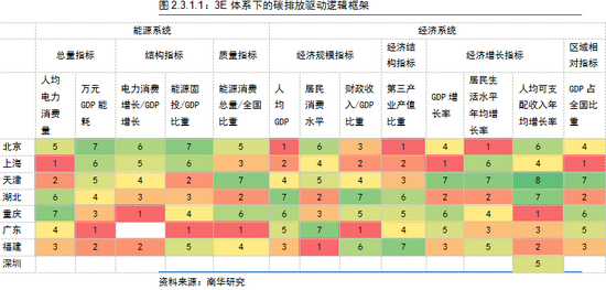根据上述逻辑框架中各项指标的梳理,最终我们得到不同碳排放交易试点的碳排放驱动因素情况。如表所示。