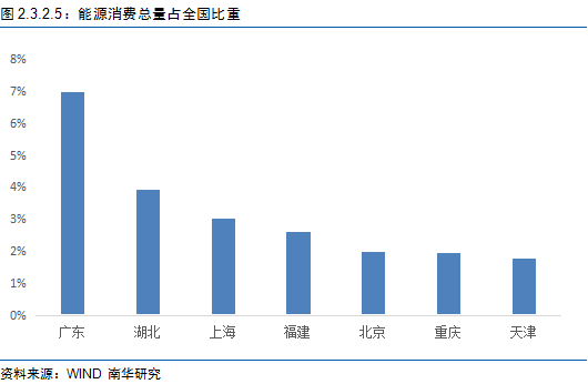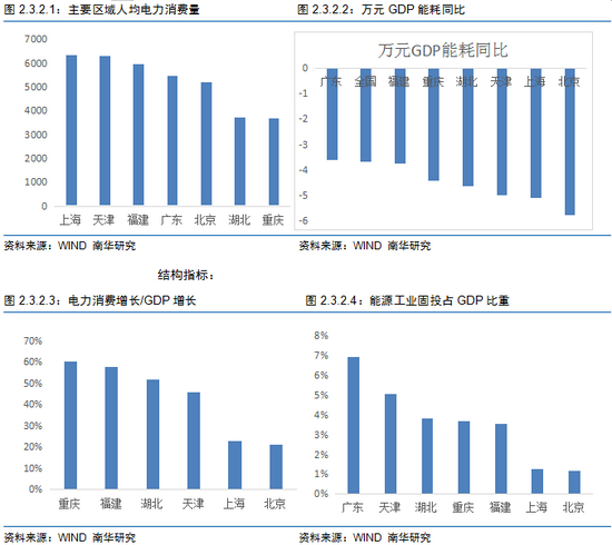 从碳排放增长驱动来讲,建筑业、通用专用设备制造业、交通运输设备制造业等在投资、消费以及出口方面对碳排放量有不同的贡献度。比如建筑业的碳排放量主要集中在固投方面;通用专用设备制造业的碳排放量主要集中在固投和出口;交通运输设备制造业的碳排放量主要集中在固投、城镇居民消费以及出口。因此,固投排名靠前的广东、天津、湖北;电力消费比较靠前的重庆、福建;能源消费比较靠前的广东、湖北、上海。