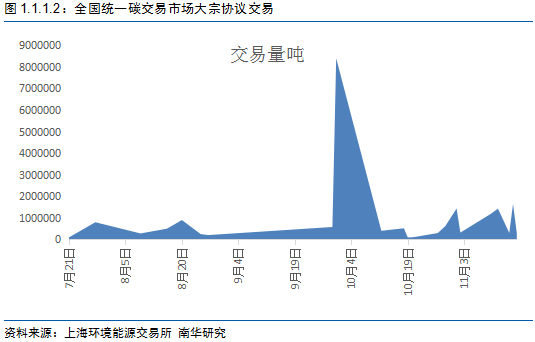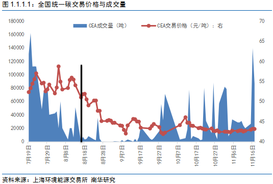 全国统一碳交易市场走势可以分为两段来分析:7~8、9~12。其中7月16日全国统一碳交易市场才刚形成。运行至满月,碳市场呈现“价格稳定,交易量萎缩”的特点;8月下旬开始,碳价格随着交易量的继续低迷而下跌,随后维持在40~45元/吨区间波动;