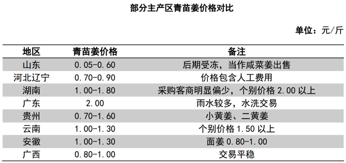 面积、产量同比增幅均较大,导致本年度新姜价格行情明显低于去年同期,多数种植户处于亏损状态,部分主产区青苗姜交易价格参考下表。今年北方青苗姜农户价格在0.05-0.6元/斤不等,而去年同期普遍在2-3元/斤,同比大幅下滑。