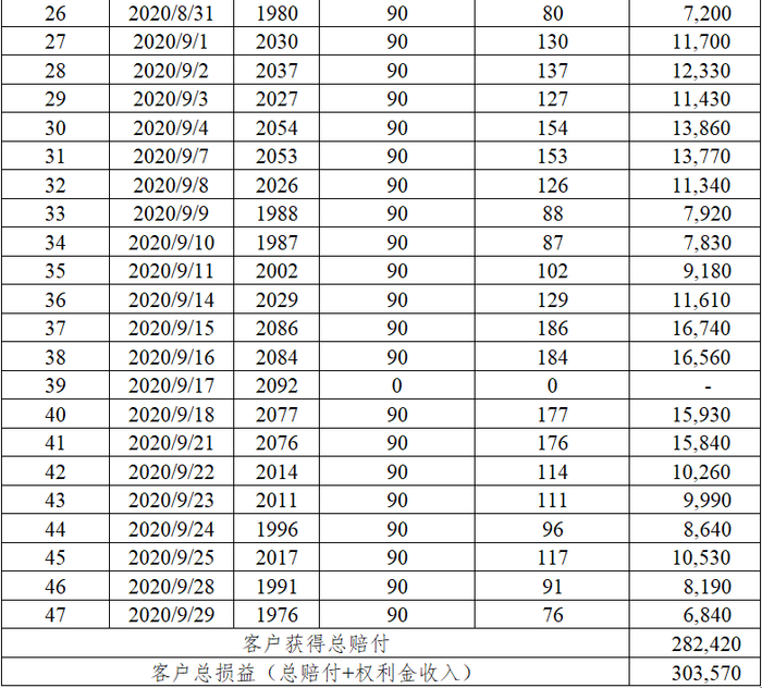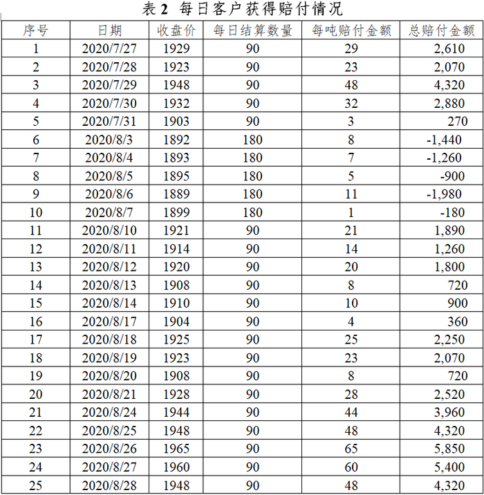 本项目交易期间共有47个交易日,客户合计获利303570元。在交易期间,收盘价低于执行价为5天,累计结算900吨,客户赔付风险子公司5760元;收盘价高于执行价且低于敲出价格为41天,累计结算3690吨,客户获得赔付288180元;收盘价高于敲出价格仅1天。客户获得总赔付282420元,叠加上权利金收入,合计盈利303570元。