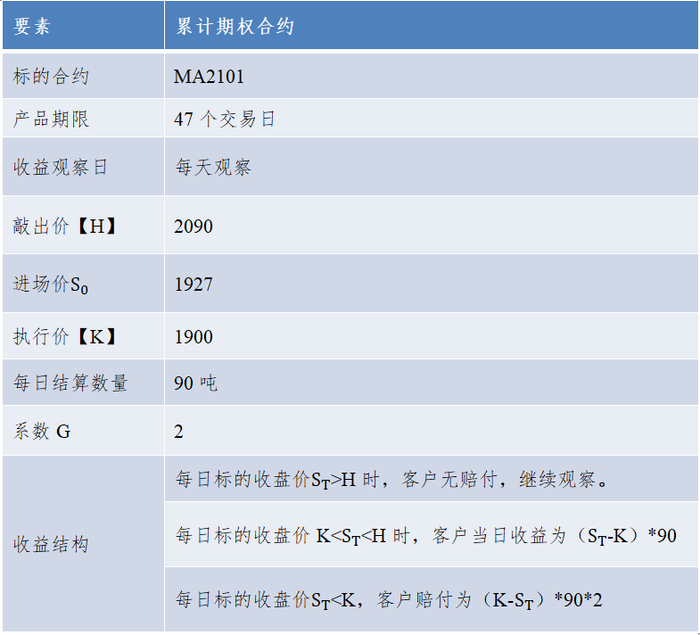 考虑到企业有长期采购甲醇现货的需求,结合当前现货远期升水的背景,需要购买看涨期权来防范甲醇价格上涨风险。但是单纯购买看涨期权的权利金很高,此时可以搭配卖出看跌期权来降低权利金。同时,客户表达在价格较低时愿意大量采购的意愿,所以一份买入看涨期权可以搭配多份卖出看跌期权。若为了进一步降低客户支付的权利金或者使得客户在期初阶段可以收到权利金,买入的看涨期权也可以设计成碰到即敲出结构。简单而言,客户在买入一份向上敲出的看涨期权同时又卖出多份向下看跌期权来合成一个看涨的头寸。