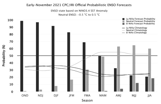 美国国家海洋与大气管理局发布的报告显示,拉尼娜现象已经发生,持续到明年2月的概率为95%。按照各种气象模型的预估情况,本次拉尼娜现象持续时间较短,一共4个月,而且峰值并不强劲,属于典型的弱拉尼娜现象。