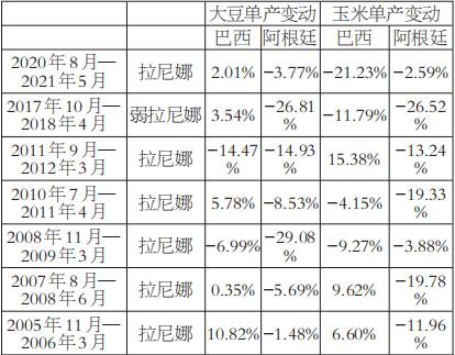 统计数据显示,对于南美大豆和玉米,拉尼娜现象造成的影响很大,只要拉尼娜现象发生在南美作物的生长期,基本都会造成阿根廷大豆和玉米减产,而巴西大部分年份不受拉尼娜现象的影响。