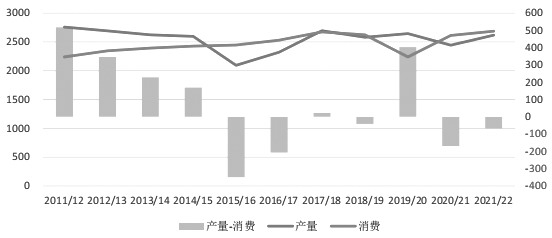 图为全球棉花产量消费情况(单位:万吨)