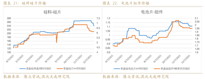 政策大力支持新能源产业链,未来光伏产业链不受能耗双控限制,预期硅料在高利润刺激下,产量稳定增加,产能释放加速。硅料高利润刺激下将有大量产能释放,据隆众资讯统计,预计2021年底,包含新投产装置及部分技改扩能,我国多晶硅产能将从2020年末的45.5万吨提升至60.9万吨,2022年末预计产能到达100万吨以上,硅料供需紧张状况将得到解决。
