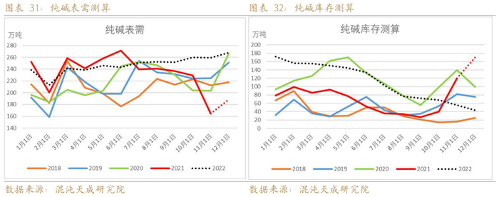 综合房地产和光伏行业的情况,2022年我们继续看好纯碱向上周期。上半年情况较为复杂,纯碱库存或维持高位,下半年伴随光伏行业好转,纯碱需求继续增加,库存逐步下降。在推算年度平衡中,社会库存不好统计,2021年底纯碱上下游博弈情绪较浓,社会库存较低,计算表需比实际表需低。