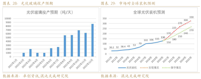 纯碱值得期待的最大需求增量仍在光伏玻璃,2021年已知的光伏玻璃投产计划较多,计划中未投产的产能有4万吨以上,在光伏玻璃利润较差的情况下基本都推迟了投产时间。2022年市场对光伏装机的预期大概在180-225GW,增速12.5%-40%,我们预期2022年硅料产能释放,光伏装机增速大概率在40%以上,预期2022年下半年光伏玻璃产能跟硅料产能基本同步释放,我们大概勾画了产能释放过程,仅供参考,任何计划都是根据实时情况变动的,需要持续观察。