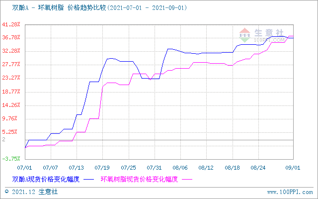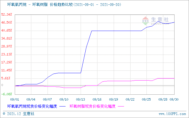 进入9月份,双酚A大幅跳水,一落千丈。九月上旬环氧树脂出现窄幅回落,但随后受双控影响另一个重要原料环氯暴涨,环氧树脂继续保持上行态势。据生意社监测数据显示,9月10日华东液体树脂市场报盘在35233元/吨,9月27日华东液体环氧树脂市场报盘在37700元/吨,涨幅7%,截止目前华东地区液体环氧树脂市场报盘在37500-38000元/吨桶装出厂价,黄山地区固体树脂市场报盘在29000-30000元/吨 ,环氧氯丙烷大幅上行是拉动环氧树脂上涨的主要原因,而环氧氯丙烷上行的主要原因一方面成本面支撑有力,另一方面“双控”影响,江苏装置开工大幅下滑,供应预期大幅减少。