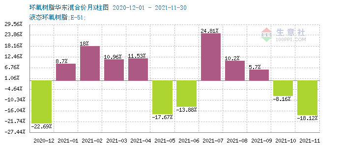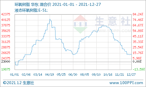 回顾2021年,国内环氧树脂大涨大跌,波澜起伏,整体呈现过山车走势。2021年环氧树脂市场的变化主要跟随成本面来波动, 据生意社监测数据显示,1月初华东液体树脂低位报盘在21750元/吨,3月底推涨至34000元/吨,截止4月19日华东液体环氧树脂暴涨至40500元/吨,涨幅86.2 %,为全年最大振幅,创十年新高,二季度季度掉头下跌,跌势明显。下半年依旧呈现先涨后跌的走势,临近年底华东液体树脂报盘在25600-26200元/吨,全年看市场上行,涨幅在13.37%。年末市场安静,商谈气氛清淡。具体来看: