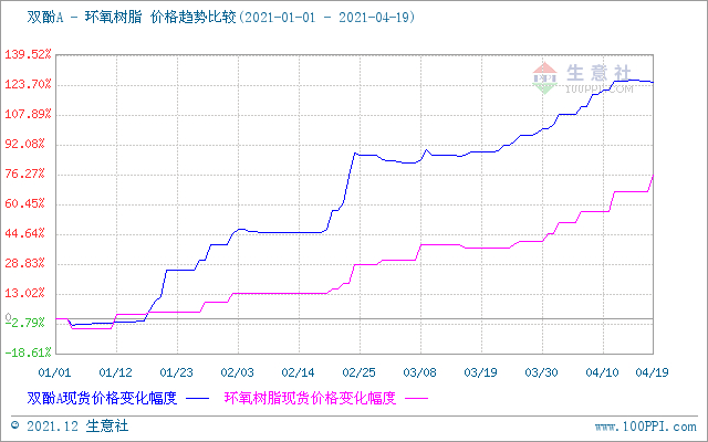 受原料双酚A大幅上行影响,高成本推动下,环氧树脂一季度呈现单边上行态势。据生意社监测数据显示,1月初华东液体树脂低位报盘在21750元/吨,3月底推涨至34000元/吨,截止4月19日华东液体环氧树脂暴涨至40500元/吨,涨幅86.2 %。上半年液体树脂价格已经到达近三年的峰值。工厂方面纷纷封盘,工厂订单排期较满至下个月,而固体树脂方面也是水涨船高,黄山周边固体树脂也在大幅提升,固体树脂报盘至33500-34000元/吨不等,涨幅较大。