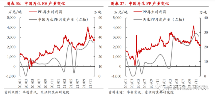 随再生料利润的回落、国内供应压力的增大以及海外供应的回归,国内新料对再生料的替代将在2022年潜移默化的进行。若假设明年聚烯烃新料价格中枢在8000元/吨,预估PE和PP的再生料平均月产量分别降至20和15万吨左右,在此情况下,PE和PP新料需求将增加2%。