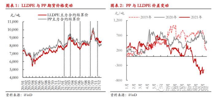 第四个阶段为9月初至11月初的暴涨暴跌。煤炭紧缺打破了市场僵持的格局,聚烯烃成本端大幅上行;能耗双控扩散的预期使得供应端有收缩的预期;同时,部分地区限电政策也导致供应在边际上收缩。在成本端和供应端的共振下,期价快速上行至年内最高点。但在国庆后,发改委依法采用行政手段管控煤价,聚烯烃成本端大幅崩塌,叠加能耗双控的影响不及预期以及高价和限电对需求打压,聚烯烃市场回吐了自9月以来的大部分涨幅。在期价下跌的行情中,PP成本重心下移的幅度大于PE,PP-L价差快速走低。