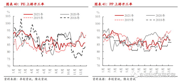而对于供应端,冬奥会的影响或比较有限,虽然这三省一市的PE和PP产能分别占国内总产能的9%和11%,但每年的采暖季(当年11月15日-次年3月15日)却是聚烯烃生产企业开工率最高的时段;再者,以2021年能耗双控政策执行最严格的9-10月为例,聚烯烃上游开工率也未见明显下滑,所以我们关注的重点应放在需求端。对此,我们认为,若后续因大气治理造成下游减产逐渐兑现,我们认为地膜行业因其生产和需求的时间窗口不可调节的特性,其所受的冲击将最为明显。