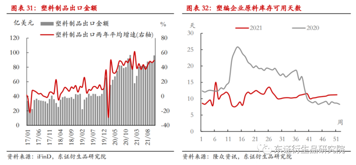 在投资领域,基建在稳增长的目标下有修复的预期。对于房地产,11月份以来,房企融资出现放松迹象,政策端的底部已经显现,且随着土地成交价款数据的回升和房地产销售数据的逐渐筑底,与房地产竣工、销售相关的塑料制品的需求将得到修复。从国内宏观角度来看,前期拖累塑料制品需求的因素正在弱化。
