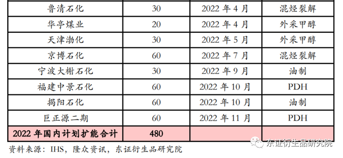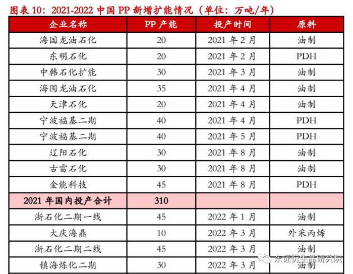 2022年国内PP新增扩能将在480万吨左右,产能增速将达到15%,高于前三年平均11.7%的增速,预计PP国内产量增速也将从12%上升至14%。从时间节点上看,新增产能在2205合约和2301合约上较为集中,且上半年浙石化和下半年的中景石化、揭阳石化和巨正源的投产进度对供应的影响较大,应注意投产时间的调整所引发的阶段性行情。