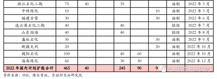疫情的干扰和极寒天气的影响使得2021年全球聚烯烃产能增速较为温和,PE新增产能主要集中在东北亚的中国和韩国,原料来源以石脑油为主。展望2022年,全球PE的扩能周期仍将延续,产能增长率预计达到7.5%,但海外扩张格局的却发生了变化。