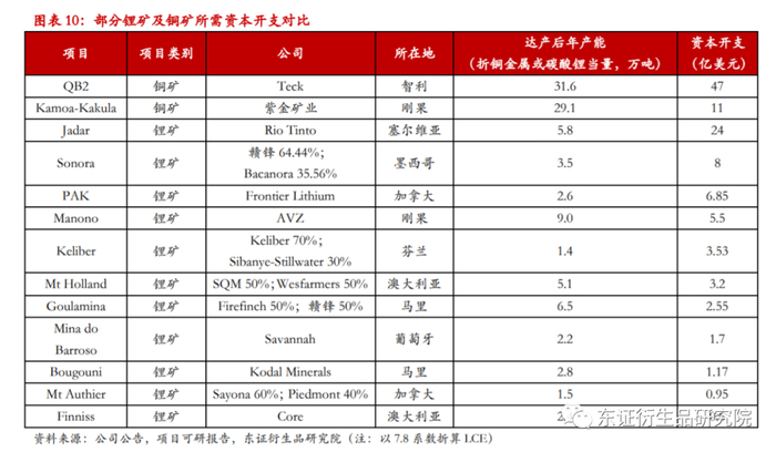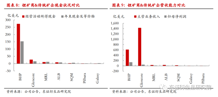 此外,对比开发一个锂矿和铜矿所需的资本开支,我们发现二者单位产能的资本开支强度并无显著区别,甚至部分锂矿的资本开支强度相对更高。但当前在产锂矿商和铜矿商的资金实力却有显著差异,大多锂矿商和锂行业一样,仍处于起步阶段,新建产能所需的大规模资本开支给现有锂矿商带来了极大的资金压力,对部分“从零开始”的企业而言,自有资金更是难以满足矿山建设所需。