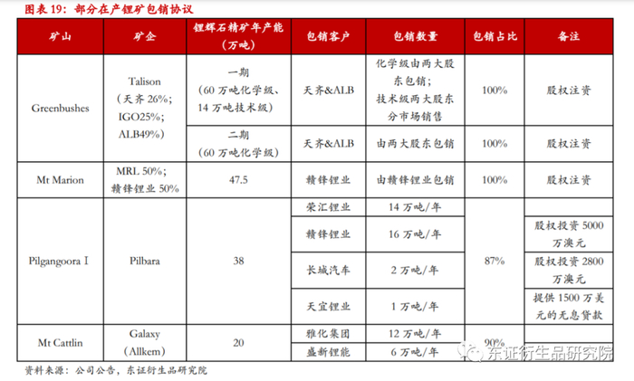 需要注意的是,这里我们测算锂矿商和锂盐厂利润时,使用的是锂精矿现货价格。而正如我们上一节中所提到的,大多锂矿商由于资金实力较弱,常常会以签订长期包销协议为条件获取外部融资,以确保项目顺利建设完工。同时,由于锂矿商的跨周期抗风险能力较弱,长期包销协议的签订也能一定程度上增强企业的跨周期能力,确保行业过剩阶段其产品能够顺利销售。如赣锋锂业2015年股权注资Mt Marion,并于2019年投资5000万澳元认购Pilbara定向增发的7763万股,从而获得了Mt Marion 100%以及Pilbara 16万吨/年的锂精矿包销权。又如为了与Pilbara建立稳定的锂精矿供货关系,宁德时代和天华超净的合资企业天宜锂业向Pilbara提供1500万美元的无息贷款,用于Pilgangoora一期的扩建项目。实际上,当前在产矿山中,锂精矿大都以包销的形式销售,仅Pilbara的Pilgangoora和Galaxy(Allkem)的Mt Cattlin尚有部分锂精矿以散单形式销售。