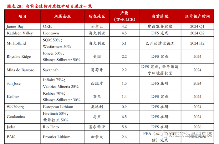 具体到锂矿,如果参考全球矿山16.9年的平均开发周期,那么2009-2010年的勘探潮所对应的锂矿产能大规模释放约在2026年前后,考虑中等规模锂矿的平均建设期约1-2年,这一时间则将略有提前。作为印证,我们大致梳理了全球当前已进入预可行性研究阶段的锂矿项目(考虑到范围研究阶段的估算准确率仅约30%,且对未来的预期相对偏乐观,项目未来投产不确定性较大,因此这里我们暂不统计处于范围研究及以前阶段的项目),当前已完成最终可行性研究的项目,考虑平均各1-2年的批复等待期以及施工建设期,预计将于2024-2026集中投产,与上述预估大致对应。