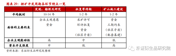 拉长时间维度,我们发现当前锂矿开采能力的不足主因矿山漫长的开发周期限制了产能落地的节奏。平均而言,矿山从首次发现到最终投产需要15-17年左右的时间,大致包括勘探及研究阶段、批复等待期以及矿山施工建设期。其中,前期勘探阶段平均耗时最久,该阶段的所需时长主要取决于企业积极性,行业景气周期内该阶段进度能够明显加快。而随着项目的推进,审批等客观因素及项目工期都会构成较为刚性的约束,进度提速的空间逐步收窄。