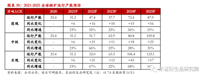 中期角度,对于更远期的新增产能,目前大都处于DFS在研或等待权证批复的阶段,部分项目的资金问题还尚未解决,后续不确定性较大。我们在企业给出的预计投产期基础上,综合考虑了各类因素,给出了中性、乐观、悲观三种情形下的产能预估。定性而言,行业景气度越持久、利润向上游集中的速度越快,企业的主观投产积极性越强,投产节奏会越趋近于我们的乐观假设,但考虑到这些绿地项目中,有31%的产能位于北美地区,其政府对采矿业的支持力度不及澳大利亚,项目审批效率较低可能会拖慢进度,此外还有24%的产能地处非洲,配套基础设施的建设也会拖慢项目施工进度。中性情景下,2022-2025年每年新增产能分别为21、11、18、25万吨LCE,至2025年全球运行产能达105.8万吨LCE,年平均增速36%,而乐观和悲观情景下的年均增速则分别为41%和30%。