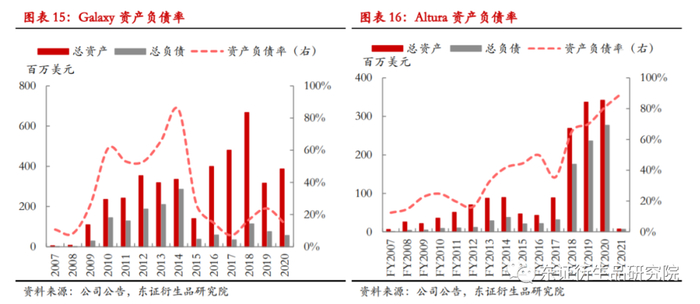 此外,外部融资带来的融资成本会加重企业未来数年的负担,如果是债务融资的方式,过高的资产负债率还会给企业的现金流带来压力。例如,2009-2012年,Galaxy Resources通过债务融资的方式筹集资金,促成Cattlin矿山和江苏锂盐厂分别于2010年和2012年投产。但后续行业低迷,使得企业持续亏损,资产负债率一度升至85%。2013年,Galaxy成立了特别管理委员会,通过债转股、债务延期、出售锂盐厂等方式降低资产负债率,并自2017年起奉行无负债经营。Altura也是由于此前大量举债建设矿山,2020财年资产负债率达81%,在行业进入低谷期后无力偿还债务而破产。