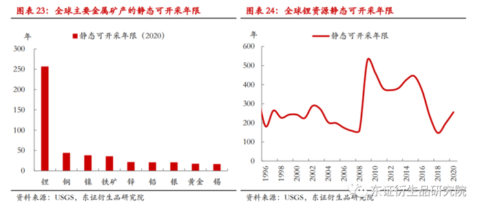 从矿产资源的静态可开采年限(全球资源储量与年产量之比)来看,锂当前的静态可开采年限高达256年,而横向对比其他金属矿产,铜、镍、铁矿、锌分别为44、38、35、21年。这说明当前锂元素供应端的瓶颈主要在于采选能力的不足而非资源的稀缺。