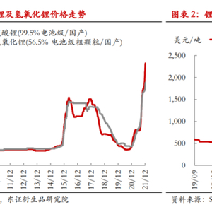 今年以来,受益于海内外新能源汽车渗透率的快速提升,以及各国碳中和承诺催生的电化学储能需求,下游需求向好带动锂供需格局显著改善,电池级碳酸锂及氢氧化锂的价格分别由底部的4万元/吨、5万元/吨升至当前的25.9万元/吨、21万元/吨,上游锂精矿价格也底部回升,现货价格由不足400美元/吨攀升至2050美元/吨,涨幅达413%。