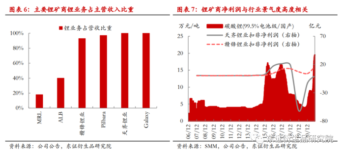 主营构成角度,我们发现MRL和ALB的业务相对较为多元化,MRL的主营收入中,74%由铁矿石贡献,锂占比仅18%;ALB的主营构成中,除了占比40%的锂之外,溴和催化剂业务也分别贡献了35%和25%的营收。而除此之外,其余在产锂矿商的主营构成都非常单一,锂业务贡献占比均在90%以上,这使得企业的整体盈利状况与行业周期高度绑定。