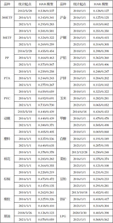表1展示了22只期权产品的HAR模型预测结果,每个单元格展示了两个数值分别是HAR模型预测结果的R2和调整R2,这两个数值越大表示该只期权产品的波动规律越容易被预测。同时,表1中针对一只期权产品展示了3个时期的HAR模型预测结果,3个时期分别是从2010年1月1日起(11年)、从2016年1月1日起(6年)、从2021年1月1日起,这3个时间段分别代表了HAR模型对于长期、中期和近期的预测结果。如果该品种在2010年1月1日没有数据,那么从该品种上市开始度量,例如300ETF就是从2012年5月28日开始度量HAR模型的长期预测结果。此外,还有原油和LPG是从2016年1月1日之后才开始上市的,故它们只包含中期和近期HAR模型的预测结果。