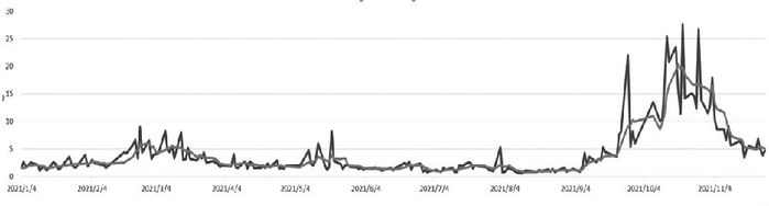 为了进一步说明HAR模型的R2表示的含义,本文比较了PVC和原油两个品种的波动率RV在2021年的走势,如图1、图2所示。选择这两个品种是因为它们在2021年的R2一个是第一名,一个是最后一名。