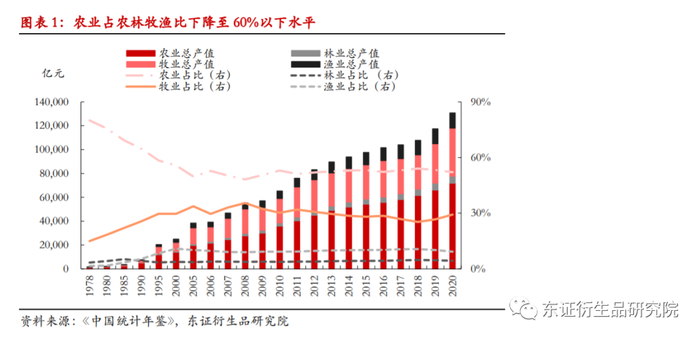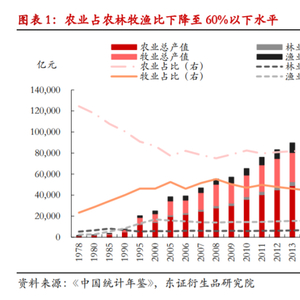 自改革开放以来,我国大农业产业由单一转向四业并进,其中畜牧业得到迅速发展,产业结构发生显著改变。从产值组成来看,1978年牧业产值占农林牧渔总产值比仅15%,同年农业产值占比高达80%,处于绝对主导地位;2000年以来,农业产值占比下降至60%以下水平,牧业占比提升,维持在25%-30%水平区间,产业结构日益合理。