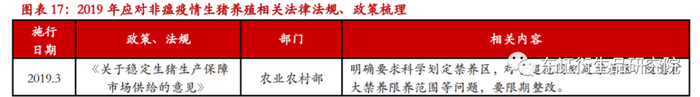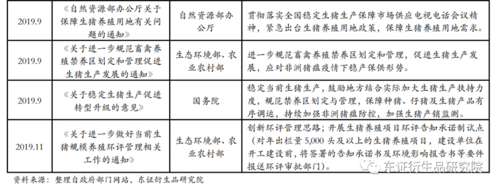 考虑到不同地方政府在禁养区政策的落实过程中存在“一刀切”等工作误区,过严的环保政策对生猪养殖规模化发展产生不利影响。为支持生猪产能恢复,2018年到2019年,面对非洲猪瘟疫情的冲击,《关于做好畜禽规模养殖项目环境影响评价管理工作的通知》、《自然资源部办公厅关于保障生猪养殖用地有关问题的通知》等陆续颁布,从稳产保供的角度对科学划分养殖场区域、生猪养殖环评批复作出进一步规定。