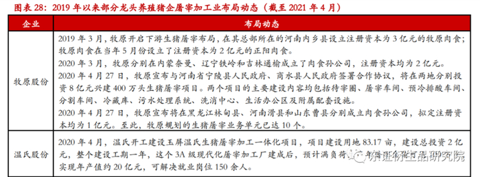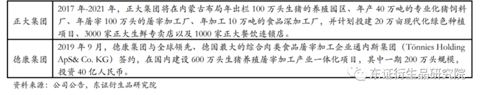 一方面,环保政策的持续推进将加快横向整合进程。另一方面,近年来,在非瘟、新冠疫情尚未得到有效防治的宏观环境下,生猪调运管控环节将有望延续“运猪”改为“调肉”的政策要求,冷鲜肉、冻肉需求增加的同时屠宰、加工厂商生猪外购价格处于高位,成本负担加重,养殖业内龙头企业可利用成本及规模优势开展屠宰加工业布局,加速行业纵向整合。