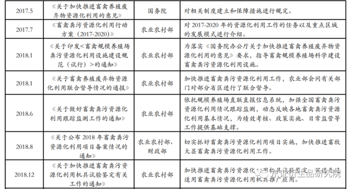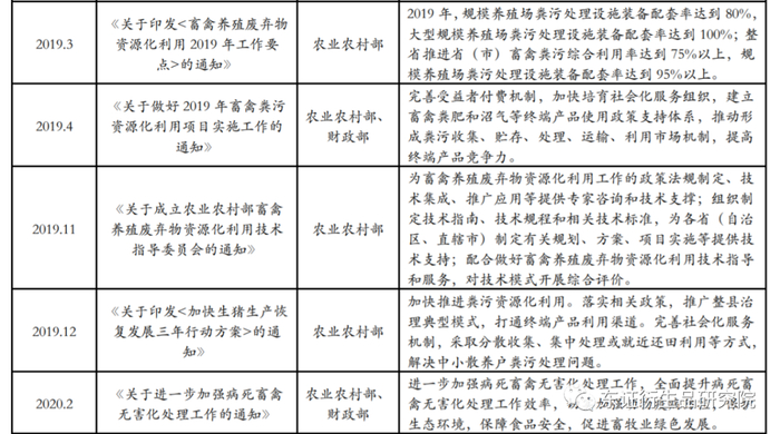 近年来,废弃物资源化利用制度的陆续出台下生猪粪污资源化利用得到有效发展,据农业部,2019年全国畜禽粪污综合利用率已超过70%,具体政策梳理如下: