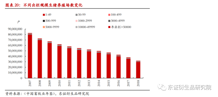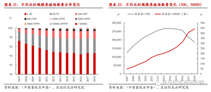 从养殖场结构来看,受资金、人员的限制,我国历史以来生猪养殖行业散户较多,规模养殖场数量上占比低。2007年以来,散户退出速度加快。2007-2018年,年出栏50头以下的养殖场(户)数量由8,010万个持续下滑至2,986万个,降幅高达62.7%;单场年出栏规模在500头以上的规模化养殖场已进入结构调整阶段,经历增长高峰后自2014年逐步下降。其中,5万头以上的生猪养殖场数量实现快速增长,较2007年的50家,2018年已达443家,年出栏量向头部企业集中趋势显著。