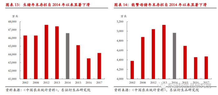 以禁养区为首的环保风暴对我国生猪供给产生巨大影响。禁养区猪场拆迁开始后,原有生猪与能繁母猪被迁往屠宰场和其他非禁养区,中小养殖户在两者间的成本考量下往往选择前者,即主动送往屠宰场。叠加环保加码下养殖户主动去产能的影响以及出栏效率提升后对核心母猪需求量的下降,我国生猪存栏量、能繁母猪存栏量自2014年以来显著下滑。