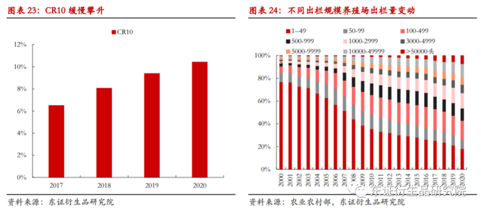 伴随行业内企业逆周期扩张,规模化程度已显著提升,我们认为规模化与绿色养殖之间的矛盾也将持续存在。一方面,市场风险、经济收入、环保压力倒逼小型散养户加速退出市场,规模化趋势不变;另一方面,大型规模猪场的环保治理成本相对小型猪场更高。因此,对规模企业而言,依托先进管理技术的精细化养殖是行业头部企业绿色养殖的必经之路。从效率提升的角度,产业链上下游一体化将促进产业资源整合,更好的适应产品跨区调运新形势。